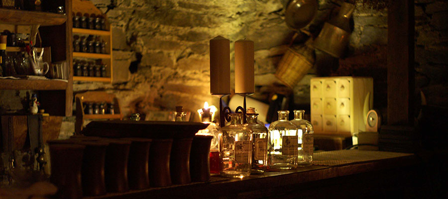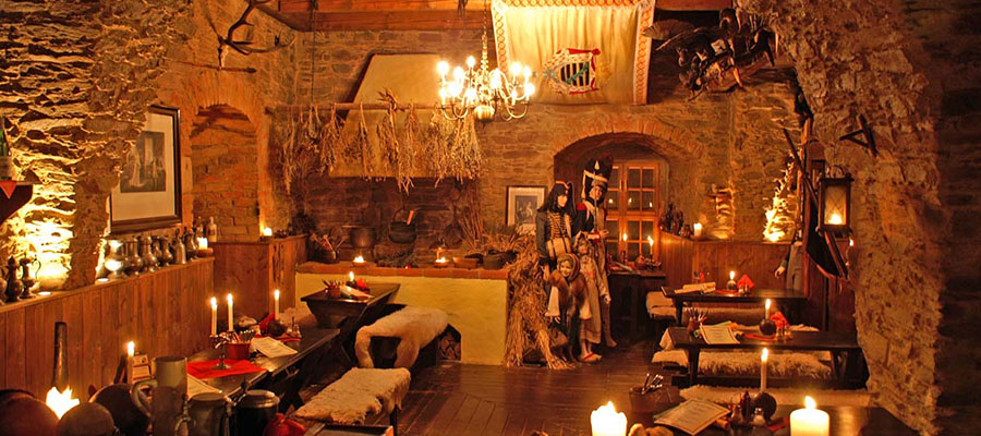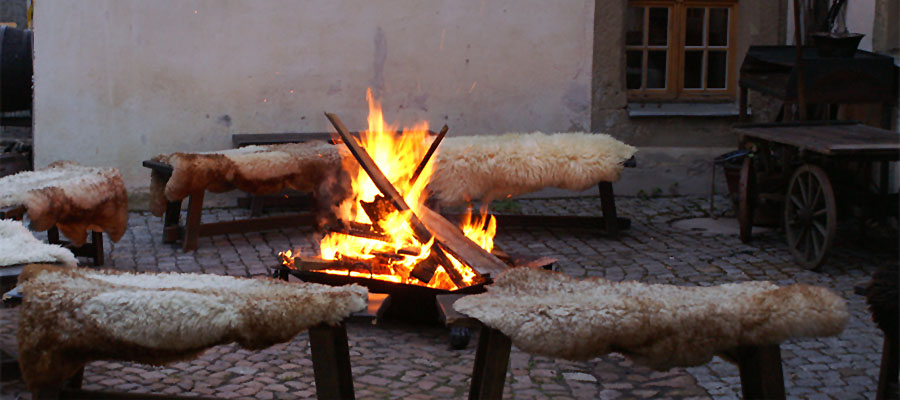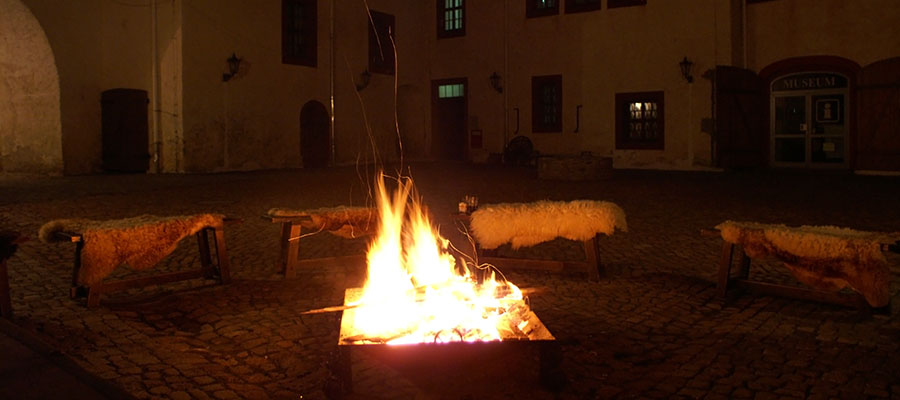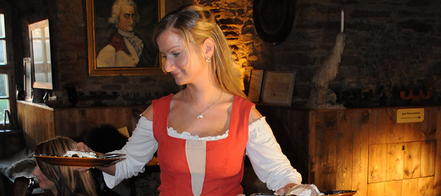 Um diesen Eindruck zu verstärken, fällt Ihr Blick auf roh gezimmerte Holzbänke, die mit Tierfellen „gepolstert“ sind. Eine Ecke unserer Schankwirtschaft war einstmals die Schlossküche. Heute erinnert nur noch ein gemauerter Herd, bestückt mit Töpfen sowie getrockneten Kräutern daran.