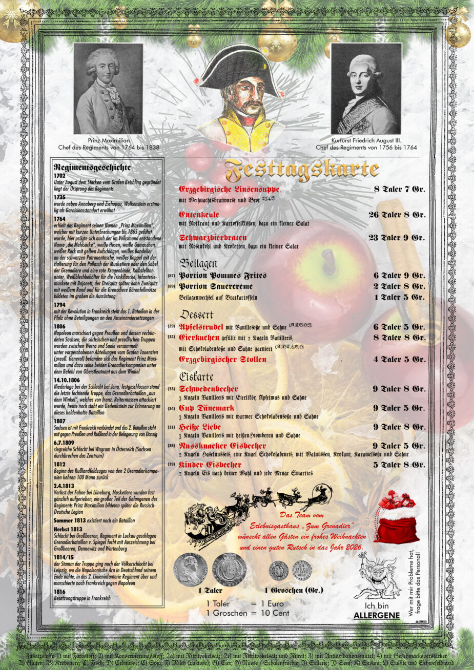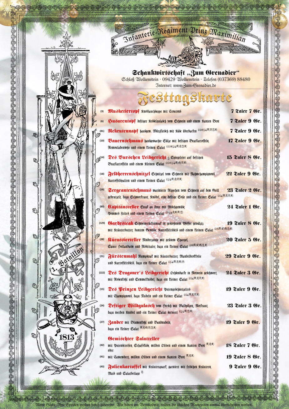 Festtagskarte - Erlebnisgasthaus "Zum Grenadier"